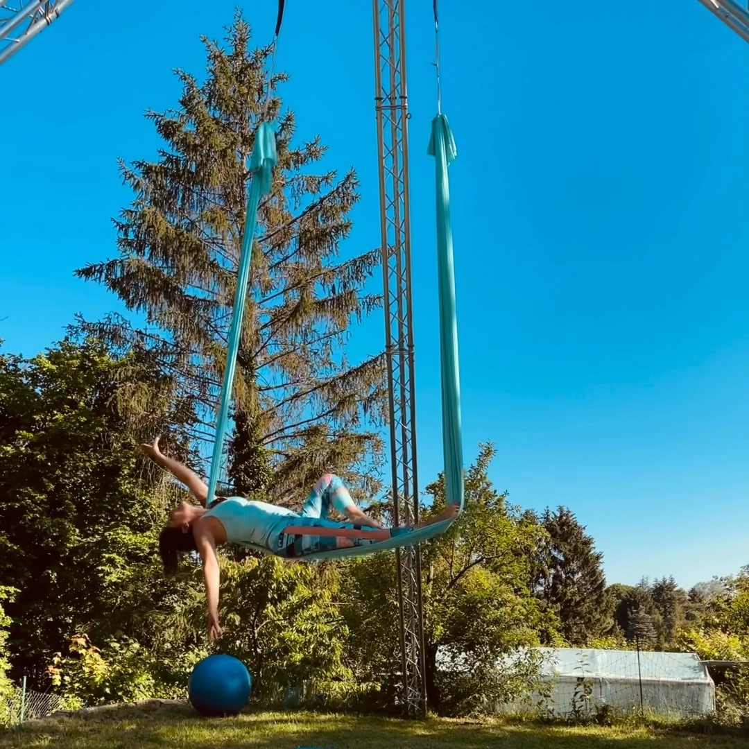 LuftZirkel bedeutet, dass wir mehrere „Geräte“ aufhängen. Je nach Bedarf und Wunsch: Aerial Silks – Vertikaltuch, Aerial Straps – Strapaten, Aerial Hoop – Luftring, Aerial Loops – Schlaufen, Trapeze – Trapez. Natürlich ist auch die „Sportgardine“ immer dabei!